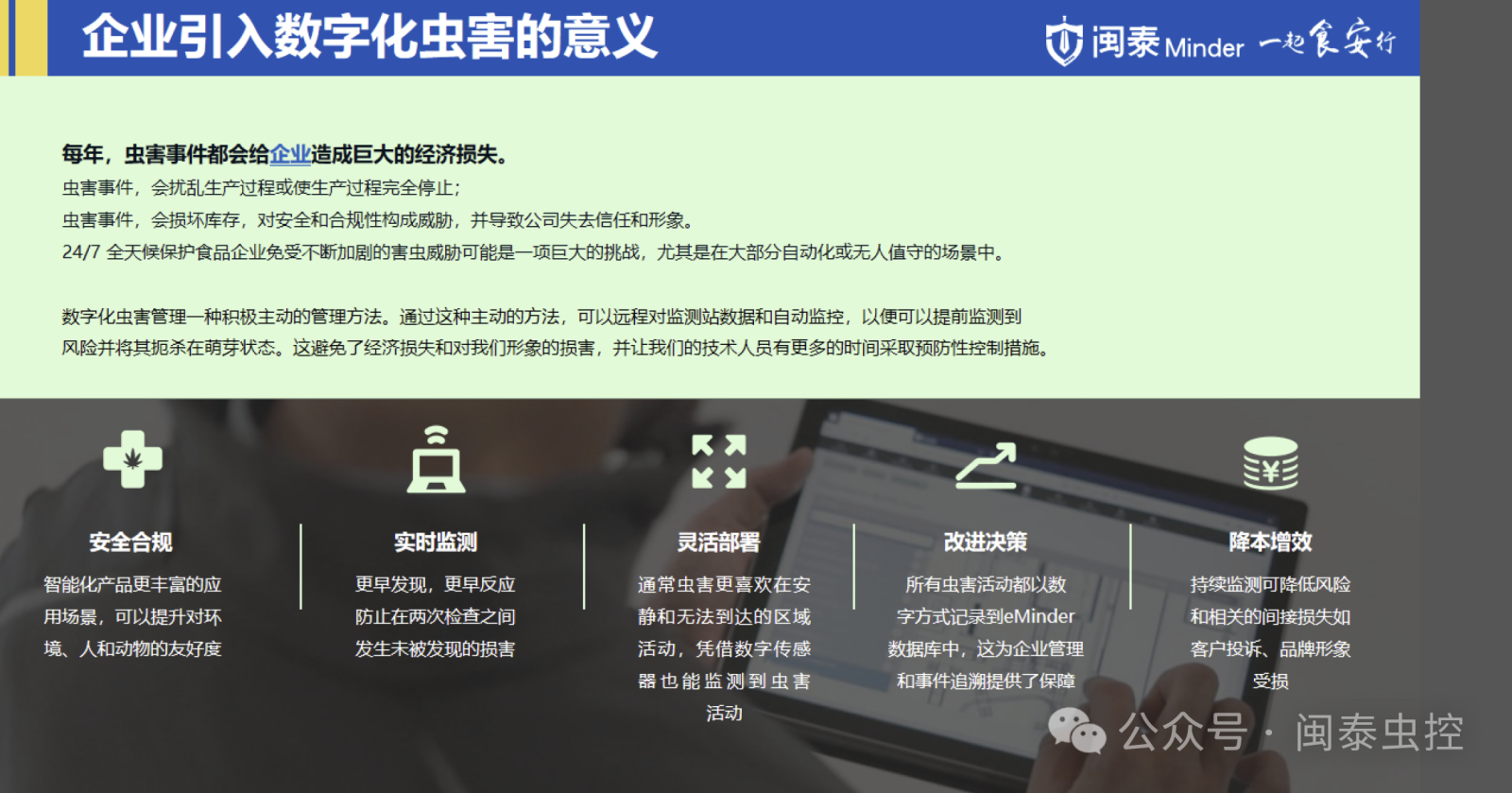 閩泰Minder客戶總監(jiān)周立老師詳細介紹了綜合蟲害數(shù)字化管理進程,周老師也根據(jù)自身多年的行業(yè)經驗,用豐富的案例對企業(yè)蟲害管理的現(xiàn)場進行分析,總結了綜合蟲害管理的核心原則,并指出隨著信息技術的發(fā)展,數(shù)字化管理逐漸成為IPM的重要組成部分,為企業(yè)提供了更加高效、精準的蟲害管理工具。