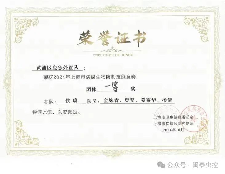 與此同時,閩泰Minder技術部的姜賽華、楊倩兩位技術骨干,作為黃浦區(qū)病媒生物應急處置隊的核心成員,與黃浦區(qū)疾控中心(區(qū)衛(wèi)監(jiān)所)的專業(yè)技術團隊金姝青、樊堅并肩作戰(zhàn),在疾控病媒科組的激烈競爭中脫穎而出,榮獲團體一等獎。這不僅是對黃浦區(qū)公共衛(wèi)生應急處理能力的肯定,更是對閩泰Minder在病媒生物防控領域深度參與和貢獻的認可。